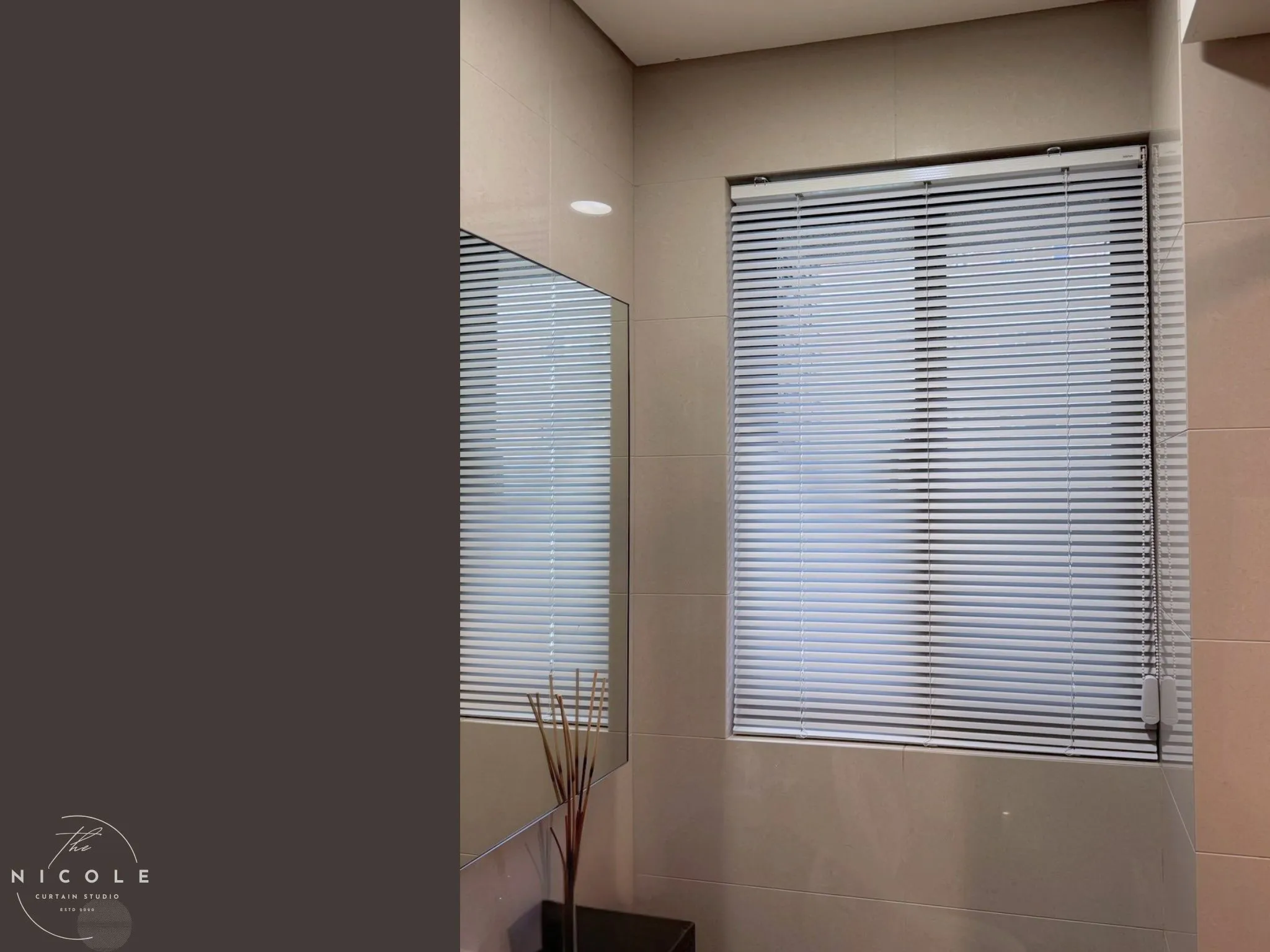 25MM葉片比50MM更細緻,適合衛浴這種較小尺度的窗型,能保留窗框俐落感,也方便更細膩地調整採光角度。色系可延續 白灰、霧銀灰,與鏡面、五金、磁磚一起維持清爽一致。