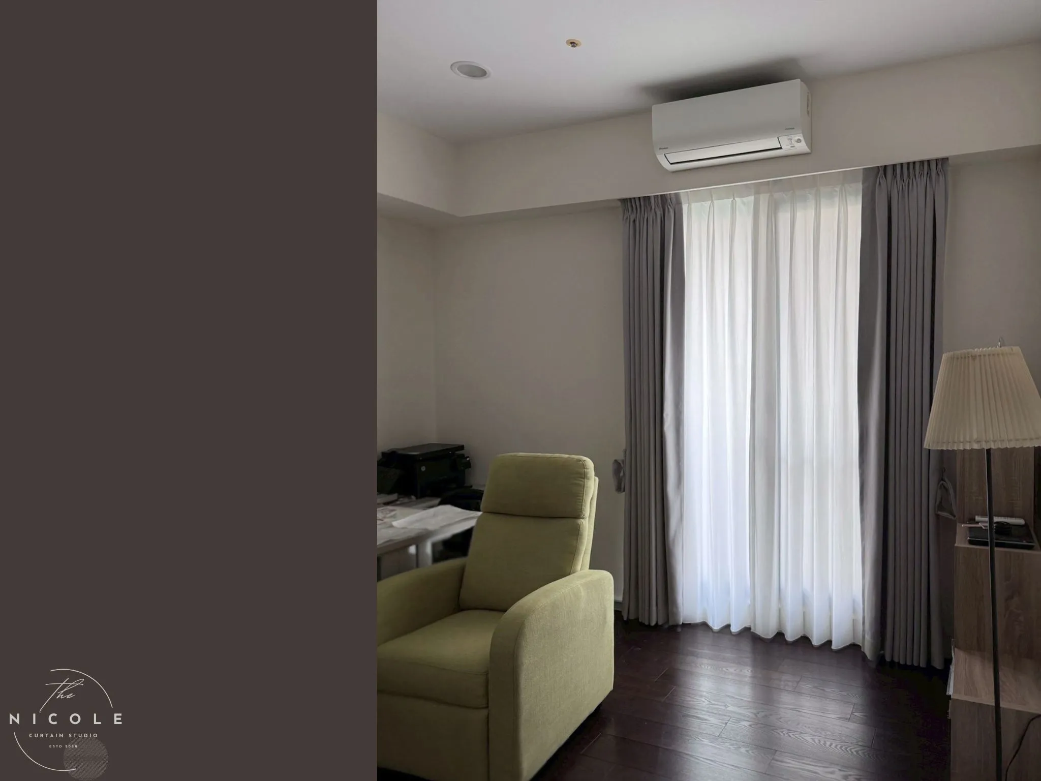 主臥以沉穩、乾淨、放鬆為主軸,從照片可看出深木地板、淺灰牆面與白色空調構成很平衡的現代臥室表情。這樣的空間若想做出真正有層次的休息感,最適合使用 雙層布簾(折景簾):外層選 高遮光灰色布簾,內層搭配 高隱私白紗簾。