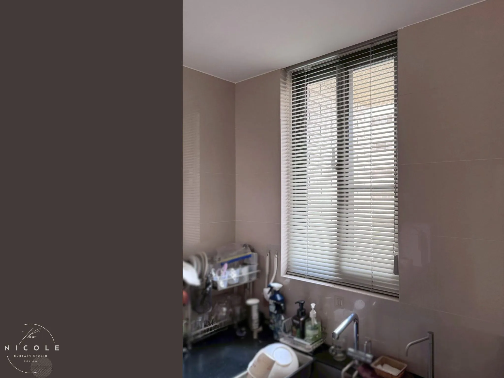 廚房照片中可以看到牆面磁磚帶有 淺灰米、霧可可灰 的細膩色調,檯面則偏深色,整體是很有質感的現代住宅廚房。這類空間若用布簾,雖然柔和,但在油煙、水氣與清潔頻率上都不夠理想,因此選用 50MM鋁百葉簾 更貼近實際使用需求。