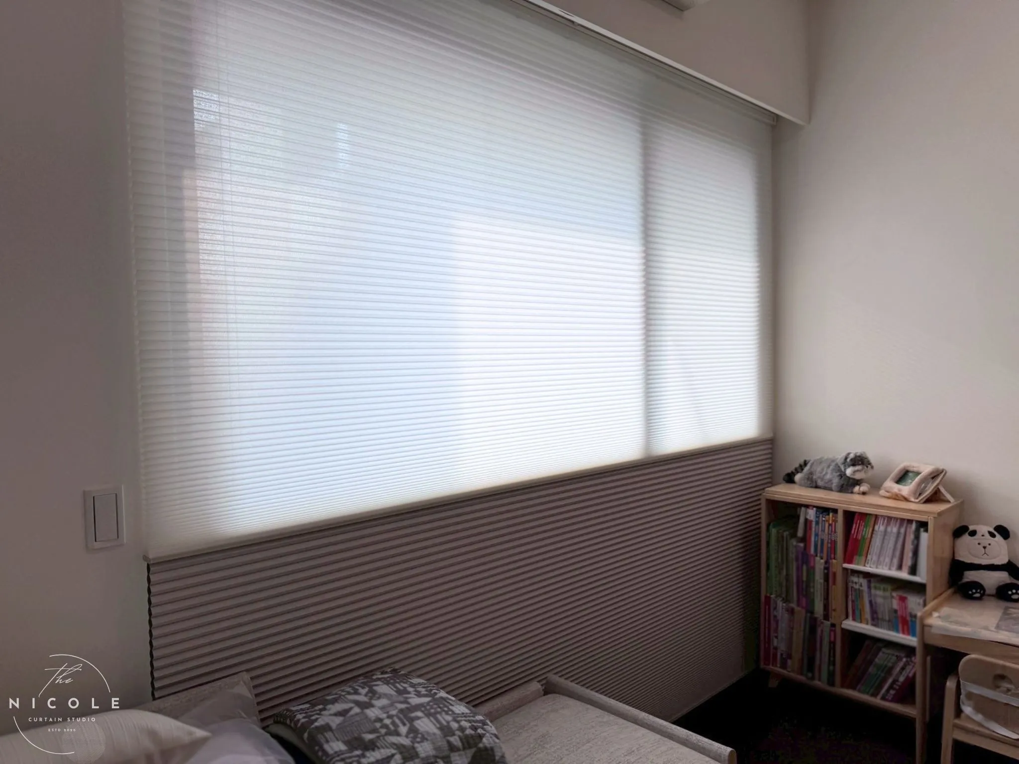 次臥作為兒童房,規劃上不能只看美觀,更要考慮作息、安全與使用便利。這次選用 電動日夜型蜂巢簾,上段可柔光、下段可加強遮蔽,適合白天活動與午睡切換。