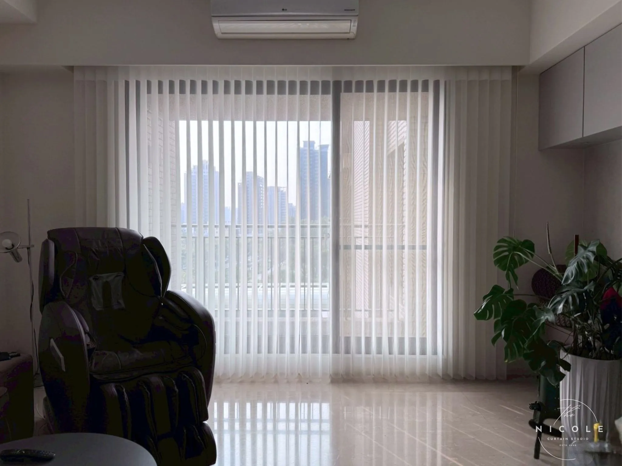 直線感的穿越簾拉高窗面比例 ,讓落地窗視覺更完整,也讓空調下方的窗景看起來更整齊。穿越簾本身具備調光與轉向優勢,「可開合、可轉向」。
