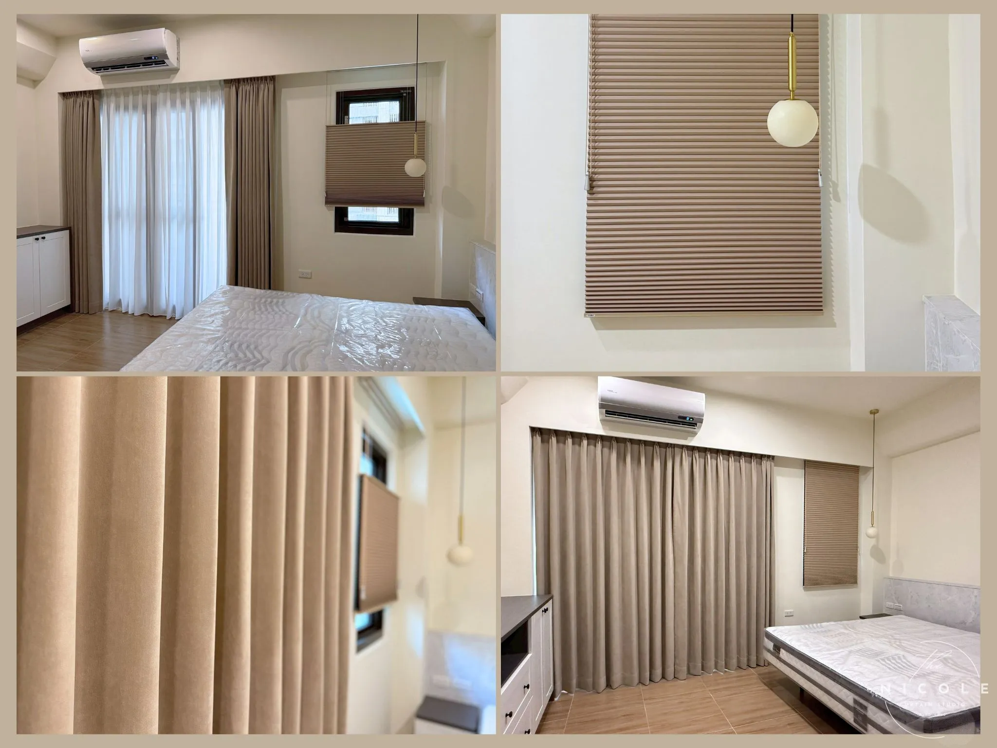 主臥以 淺米色布簾+米色遮光風琴簾 為主角,色系上貼近牆面與床架周邊的暖白、淺木、米杏色調,能把空間做得更柔、更安靜。