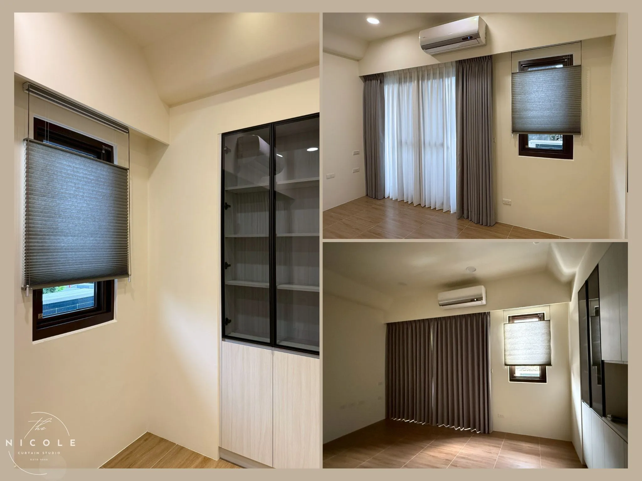 側邊小窗則使用遮光風琴簾,蜂巢結構有助於減少熱能傳導,對新竹地區日照與透天住宅常見的早晨光線干擾特別有感。這種 分窗分功能 的規劃,就是本案最實用的設計重點。