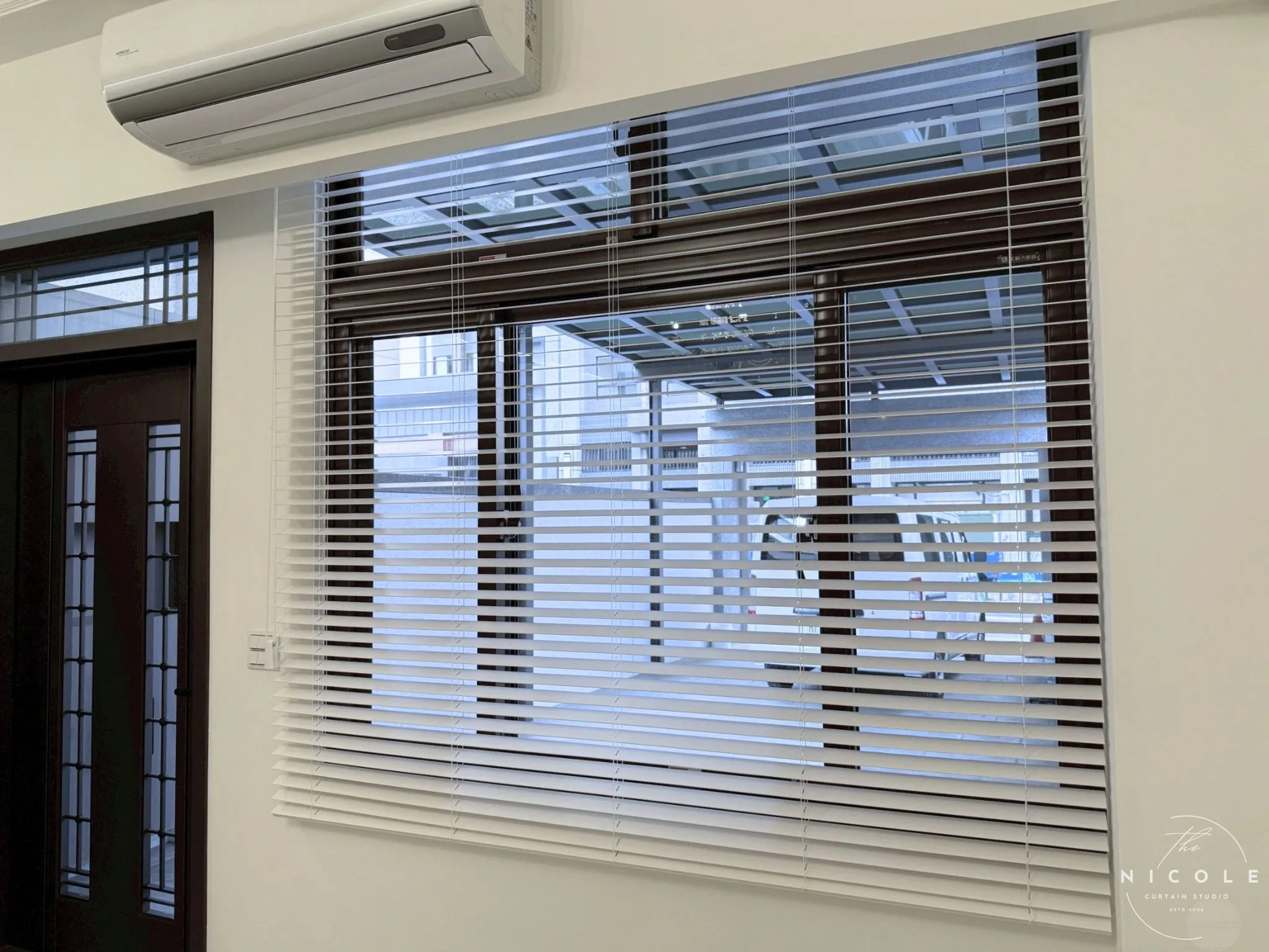 安裝上則透過 依窗框比例精準分割葉片高度、貼齊樑下與冷氣位置收整線條,讓整體看起來更平、更新屋、也更有完整性。這種作法特別適合新竹新豐透天窗簾設計,因為透天常有採光面大、日照明顯的特性,葉片角度調節能更細膩地應對光線變化。